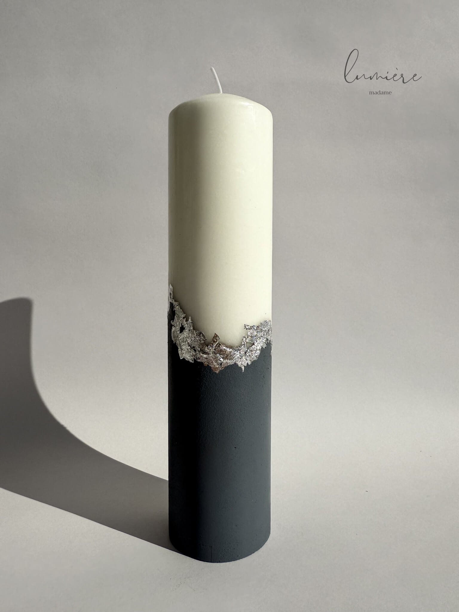 Fusion Gris Mystique aduce rafinamentul industrial în forma sa cea mai pură. O lumânare handmade din ciment gri, cu finisaj ivoire și linie de fuziune argintie aplicată manual – o piesă sculpturală pentru decoruri moderne.