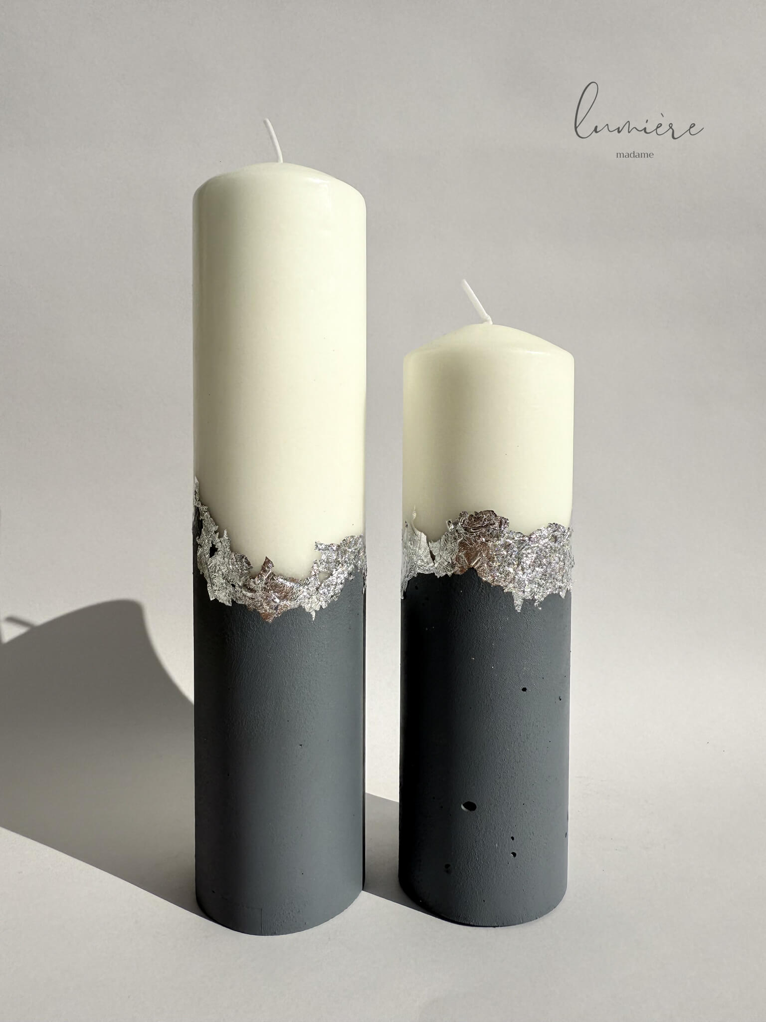 Această lumânare handmade din ciment surprinde perfect contrastul dintre forța materialelor brute și delicatețea formelor minimaliste. Corpul gri din ciment, îmbinat elegant cu ceara ivoire și detaliul metalic argintiu, transformă acest obiect într-o expresie de lux arhitectural.