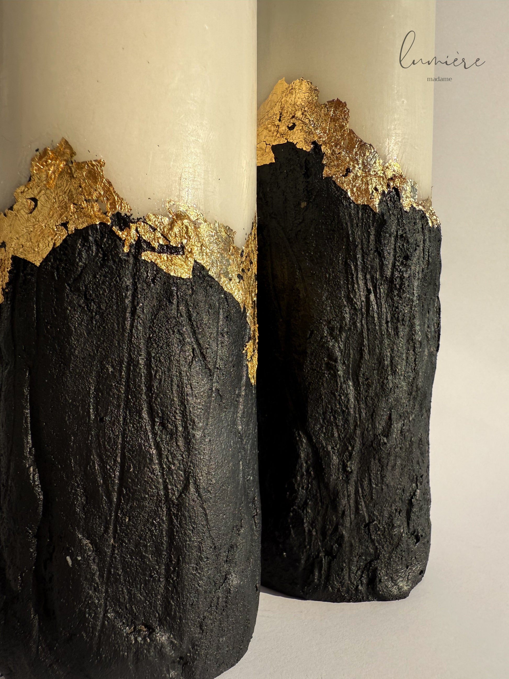 Raw Noir Élégance este expresia contrastului perfect între forță și eleganță. Setul de lumânări handmade din ciment combină texturi naturale, finisaj negru mat și detalii aurii aplicate manual – o piesă statement pentru decorurile moderne.